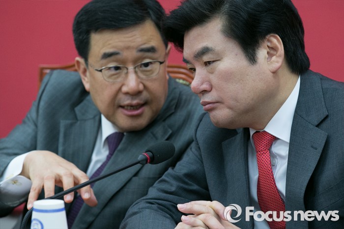 (서울=포커스뉴스) 원유철(오른쪽) 새누리당 원내대표와 김정훈 정책위의장이 11일 오전 서울 여의도 국회에서 열린 원내대책회의에 참석해 대화하고 있다.