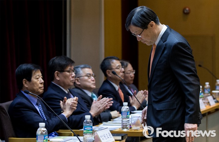 (서울=포커스뉴스) 11일 오전 서울 강남구 포스코센터에서 열린 정기주주총회에 참석한 권오준 포스코 회장이 인사말을 마친 후 자리로 향하고 있다.