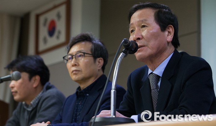 (서울=포커스뉴스) 11일 오전 서울 영등포구 중소기업중앙회 중회의실에서 정기섭 회장을 비롯한 임원들이 북한당국의 개성공단 자산 청산통보에 대한 입주기업의 입장을 발표하고 있다.