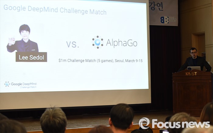(대전=포커스뉴스) 이세돌 9단과 겨루는 인공지능 컴퓨터 알파고를 개발한 구글 딥마인드 최고경영자 데미스 하사비스가 11일 오후 대전 유성구 한국과학기술원에서 '인공지능과 미래' 라는 주제로 강연을 하고 있다.