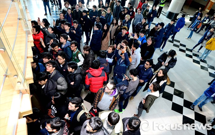 (대전=포커스뉴스) 이세돌 9단과 겨루는 인공지능 컴퓨터 알파고를 개발한 구글 딥마인드 최고경영자 데미스 하사비스의 강연이 열린 11일 오후 대전 유성구 한국과학기술원에 입장하지 못한 학생들이 행사장 밖에서 동영상을 촬영하며 강의를 듣고 있다.