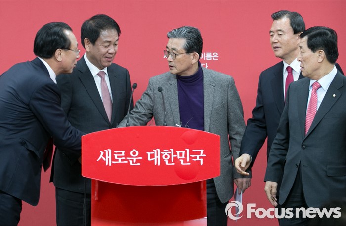 (서울=포커스뉴스) 이한구 새누리당 공천관리위원장과 위원들이 11일 오후 서울 여의도 당사에서 공관위 내부 갈등 등에 대해 사과하는 내용의 기자회견을 마친 뒤 서로 악수하고 있다. 왼쪽부터 김회선, 박종희 위원, 이 위원장, 홍문표 위원, 황진하 부위원장.