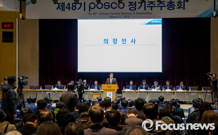 여전히 소란과 논란은 이어졌지만 권 회장은 "차질 없도록 노력하겠다"며 '이사보수한도 승인의 건'을 통과시켰다.(서울=포커스뉴스) 11일 오전 서울 강남구 포스코센터에서 열린 정기주주총회에 참석한 권오준 포스코 회장이 인사말을 하고 있다. 2016.03.11 양지웅 기자