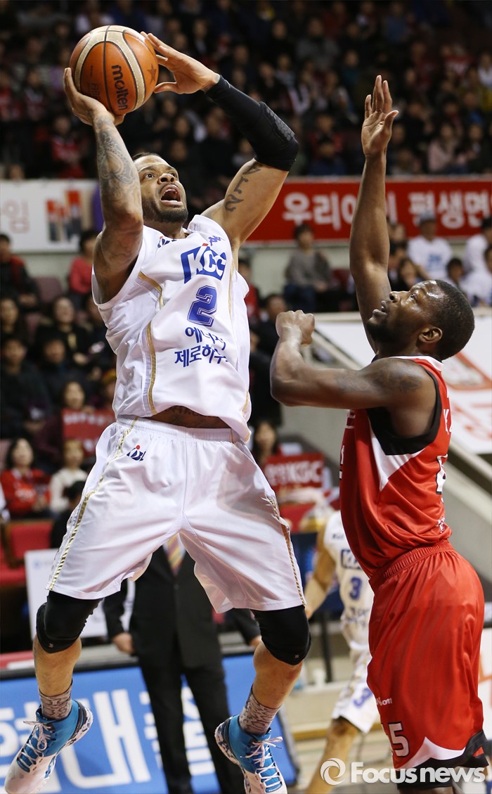 (안양=포커스뉴스) 11일 안양실내체육관에서 열린 2015-2016 프로농구 KGC-KCC 4강플레이오프 3차전에서 KCC 안드레 에밋이 KGC 마리오 리틀의 마크 위로 점프슛을 쏘고 있다.