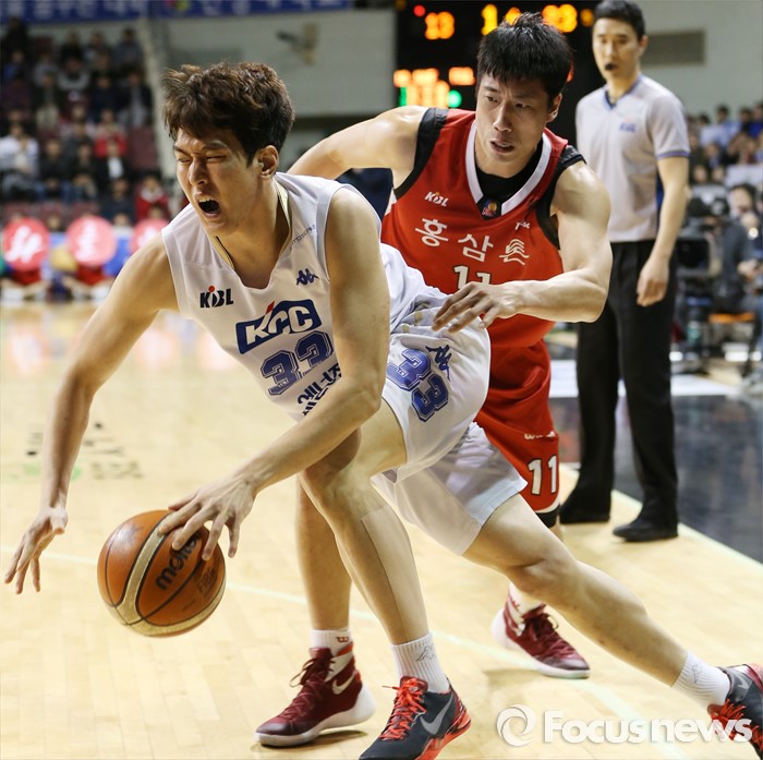 (안양=포커스뉴스) 11일 안양실내체육관에서 열린 2015-2016 프로농구 KGC-KCC 4강플레이오프 3차전에서 KGC 양희종이 KCC 정희재의 돌파를 뒤에서 저지하고 있다.