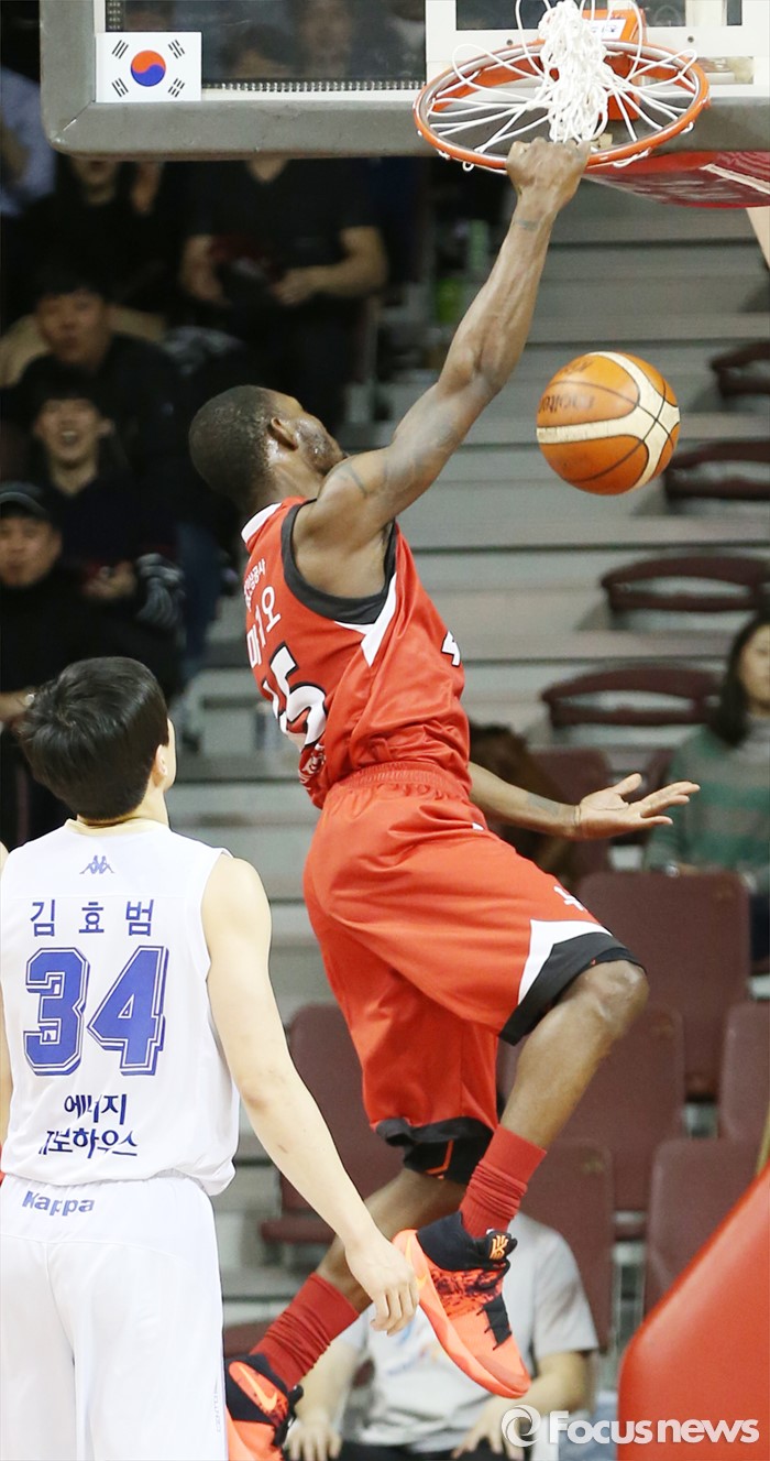 (안양=포커스뉴스) 11일 안양실내체육관에서 열린 2015-2016 프로농구 KGC-KCC 4강플레이오프 3차전에서 KGC 마리오 리틀이 원핸드 덩크를 림 안에 꽂아 넣고 있다.