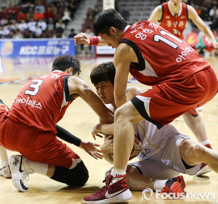 (안양=포커스뉴스) 11일 안양실내체육관에서 열린 2015-2016 프로농구 KGC-KCC 4강플레이오프 3차전에서 KGC 이정현과 양희종이 KCC 정희재의 볼을 뺏으려 달려들고 있다. 헬드볼이 선언됐다.