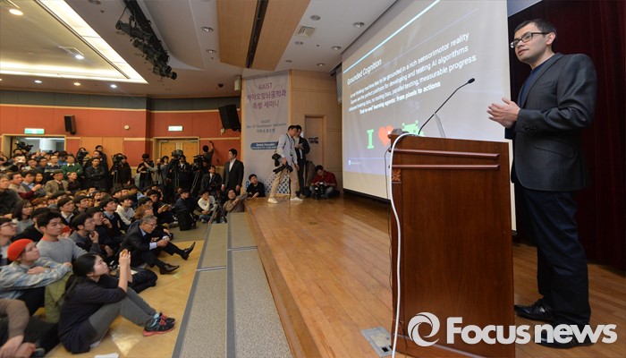 (대전=포커스뉴스) 이세돌 9단과 겨루는 인공지능 컴퓨터 알파고를 개발한 구글 딥마인드 최고경영자 데미스 하사비스가 11일 오후 대전 유성구 한국과학기술원(KAIST)에서 '인공지능과 미래' 라는 주제로 강연을 하고 있다.