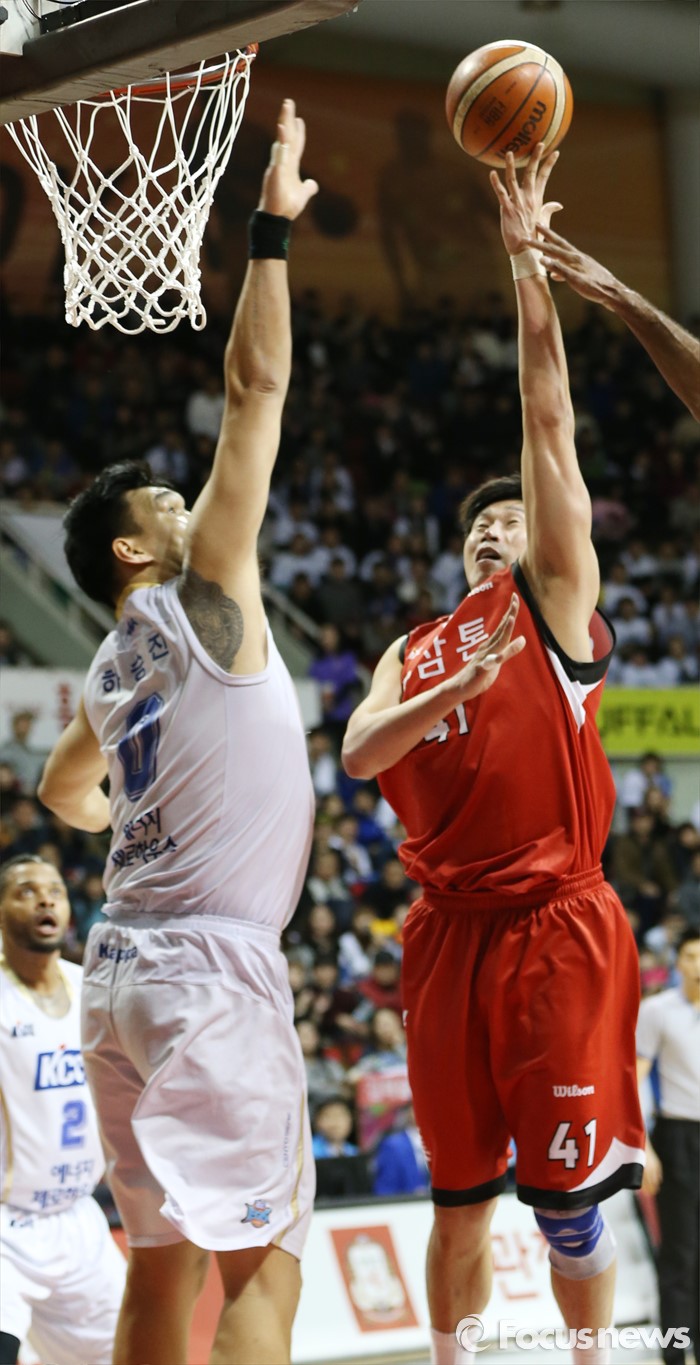 (안양=포커스뉴스) 11일 안양실내체육관에서 열린 2015-2016 프로농구 KGC-KCC 4강플레이오프 3차전에서 KGC 오세근이 KCC 하승진의 블록 위로 레이업슛을 쏘고 있다.