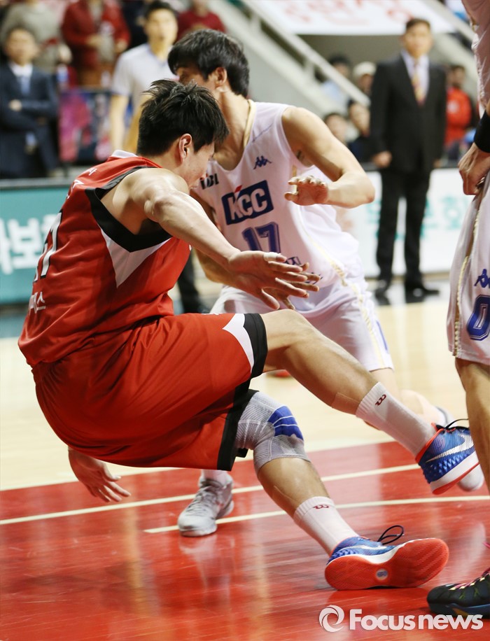 (안양=포커스뉴스) 11일 안양실내체육관에서 열린 2015-2016 프로농구 KGC-KCC 4강플레이오프 3차전에서 KGC 오세근이 점프했다 떨어질때 발목이 꺾이며 넘어지고 있다.