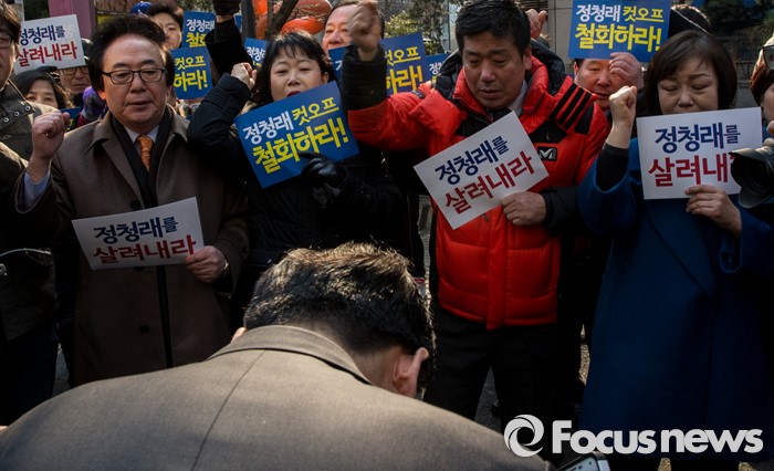 (서울=포커스뉴스) 20대 총선 공천 배제된 정청래 더불어민주당 의원이 12일 오전 서울 여의도 더민주 당사에서 공직선거후보자 추천 재심위 재심신청서 접수를 마친 뒤 지지자들을 향해 허리 숙여 인사하고 있다.