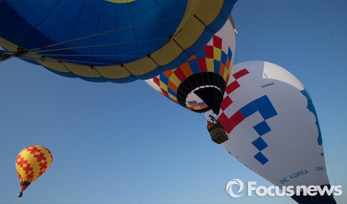 (논산=포커스뉴스) 12일 오전 충남 논산 강경읍 수변공원 일대에서 열린 2015-2016시즌 코리아열기구그랑프리 5차전 ‘오프로드컵’에서 대회에 출전한 선수들이 공중 레이스를 펼치고 있다.