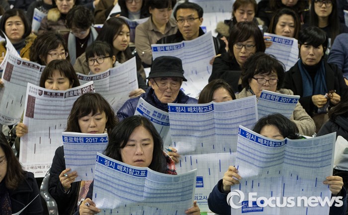 (서울=포커스뉴스) 12일 오후 서울 성동구 한양대학교 올림픽체육관에서 열린 '2017학년도 대학입시설명회'에 참석한 학부형, 수험생 및 관계자들이 주요 대학 배치참고표를 보고 있다.