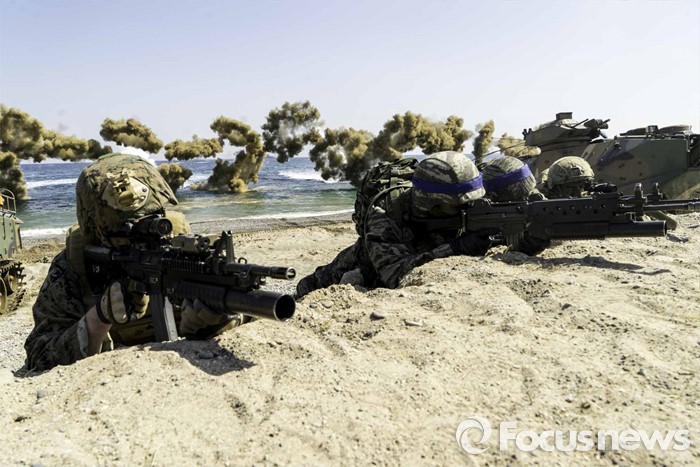 (포항=포커스뉴스) 12일 오후 경북 포항시 일대 해안에서 한미해병대의 연합상륙작전이 실시되었다. 해안가로 돌진하고 있는 상륙돌격장차들에서 일제히 연막을 전개하고 있다.