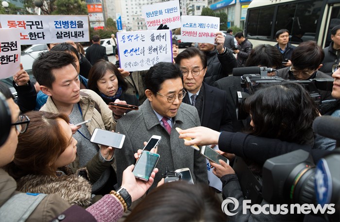 (서울=포커스뉴스) 20대 총선 공천 배제된 전병헌 더불어민주당 의원이 13일 오전 공직선거후보자추천재심위원회에 재심신청서를 제출하기 위해 서울 여의도 당사 방문 전 취재진의 질문에 답변하고 있다.