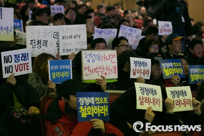 (서울=포커스뉴스) 정청래 더불어민주당 의원 지지자들이 13일 오후 서울 여의도 국회 의원회관에서 열린 더불어경제콘서트에 참석해, 정 의원 공천 탈락에 대해 항의하는 손팻말을 들고 있다.