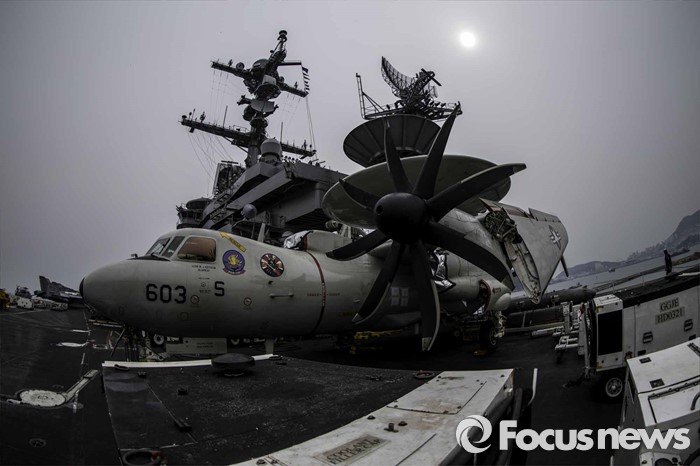 (부산=포커스뉴스) 13일 오후 부산 남구에 위치한 해군작전사령부에 입항한 존 C. 스테니스 핵항모가 취재진에게 공개되었다. 키리졸브 독수리 훈련에 참가하기 위해 한국을 찾은 스테니스항모는 길이 333m, 폭 78m,탑승 승조원은 6500명에 달하는 미 해군 핵심항모 중 하나다. 조기경보기 E-2C 호크아이 너머로 함교가 보인다.