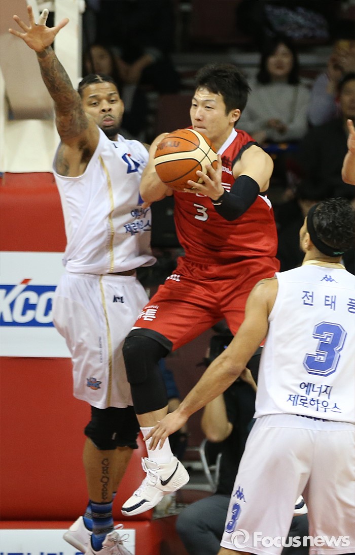 (안양=포커스뉴스) 13일 안양실내체육관에서 열린 2015-2016 프로농구 KGC-KCC 4강플레이오프 4차전에서 KGC 이정현이 KCC 에밋의 마크를 받으며 점프 패스를 시도하고 있다.