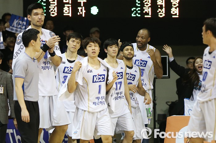 (안양=포커스뉴스) 13일 안양실내체육관에서 열린 2015-2016 프로농구 KGC-KCC 4강 플레이오프에서 KGC를 3승1패로 물리치고 챔피언결정전에 진출한 KCC 선수들이 기뻐하고 있다.