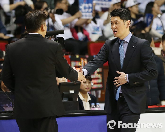 (안양=포커스뉴스) 13일 안양실내체육관에서 열린 2015-2016 프로농구 KGC-KCC 4강플레이오프 4차전을 승리해 챔피언결정전에 진출한 KCC 추승균 감독이 KGC 김승기 감독과 경기를 마치고 악수하고 있다.