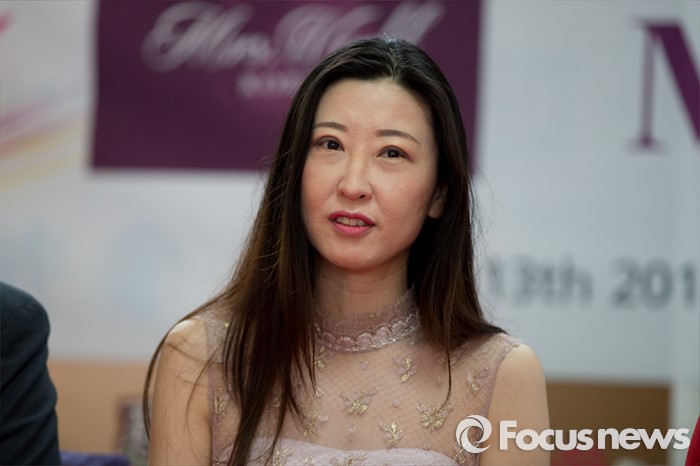 (동관/중국=포커스뉴스) 13일 오전 중국 광동성 동관 굿뷰호텔에서 열린 제28회 미시즈월드 한국 개최 기자간담회에 송지연 미시즈월드 한국조직위원회 위원장이 취재진의 질문에 대답하고 있다.