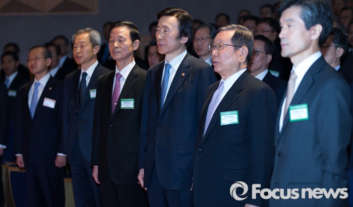 (서울=포커스뉴스) 14일 오전 서울 종로구 외교부에서 2016년도 재외공관장회의에 참석한 윤병세 외교부 장관이 재외공관장들과 애국가를 제창하고 있다. 오른쪽부터 유흥수 주일본대사, 윤 장관, 김장수 주중국대사, 안호영 주미대사.