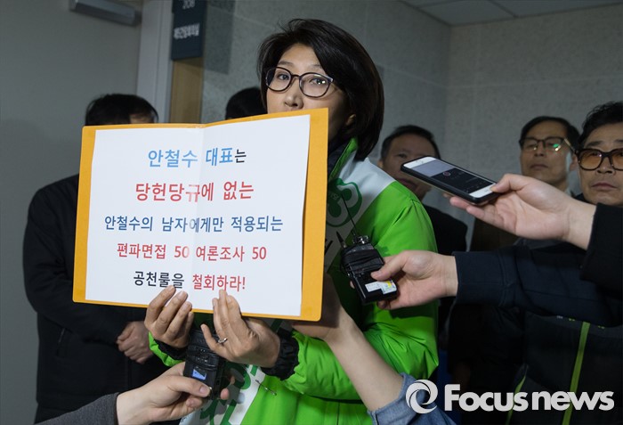 (서울=포커스뉴스) 14일 오전 서울 여의도 국회의원회관 국민의당 최고위원 회의장 앞에서 이행자 국민의당 관악을 예비후보가 피켓을 들고 안철수 대표 등 당지도부에 공천 관련 항의를 하고 있다.