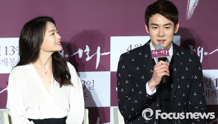 (서울=포커스뉴스) 14일 오전 서울 광진구 롯데시네마 건대입구점에서 열린 영화 '해어화' 제작보고회에 참석한 배우 유연석(오른쪽)이 인사말을 하고 있다. 왼쪽부터 배우 천우희, 유연석.
