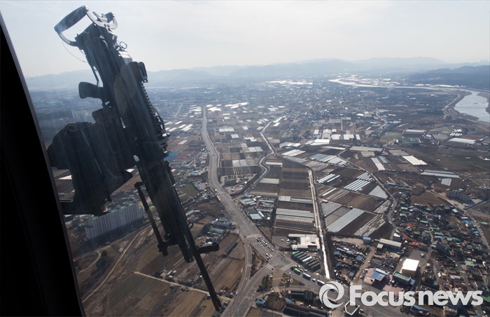 (대구=포커스뉴스) 10일 오후 제2작전사령부 예하부대에서 육군항공·특공부대 전개훈련에 참가한 국산 헬기 수리온(KUH-1)이 경북 대구와 영천 상공 일대를 전술비행하고 있다.