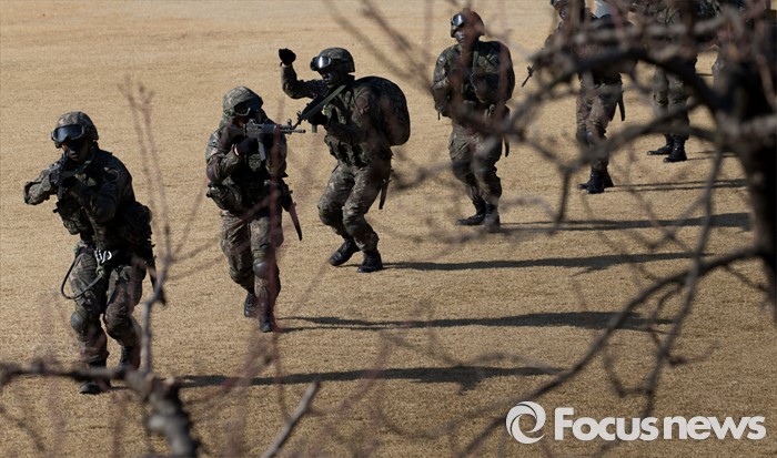 (대구=포커스뉴스) 10일 오후 제2작전사령부 예하부대에서 육군항공·특공부대 전개훈련에 참가한 201특공여단 장병들이 국산 헬기 수리온(KUH-1)을 이용해 작전지역에 침투하고 있다.