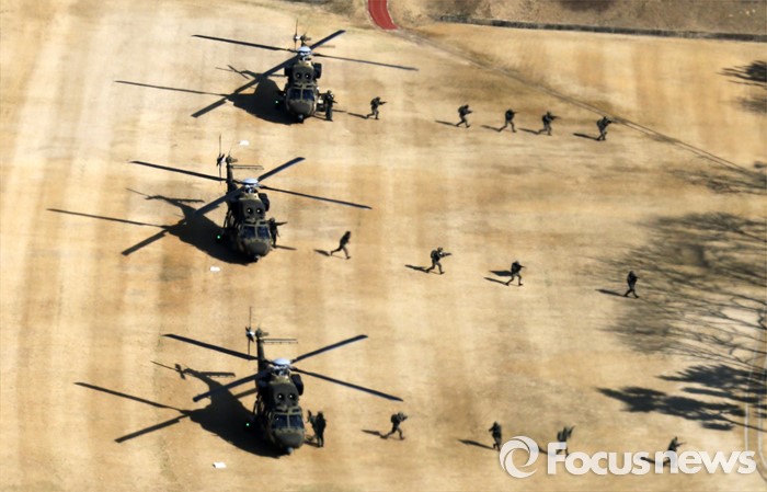 (대구=포커스뉴스) 10일 오후 제2작전사령부 예하부대에서 육군항공·특공부대 전개훈련에 참가한 201특공여단 장병들이 국산 헬기 수리온(KUH-1)을 이용해 작전지역에 침투하고 있다.