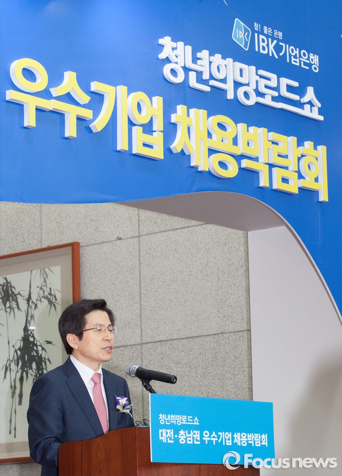 (대전=포커스뉴스) 황교안 국무총리가 14일 오전 대전시청에서 열린 청년희망로드쇼 대전·충남권 우수기업 채용박람회에 참석해 축사를 하고 있다.