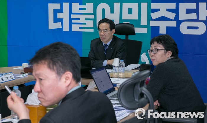 (서울=포커스뉴스) 20대 총선을 30일 앞둔 14일 오후 서울 여의도 더불어민주당사에서 열린 청년 비례대표 후보 면접에 참석한 홍창선 공천관리위원장 등 위원들이 후보들의 발언을 듣고 있다.