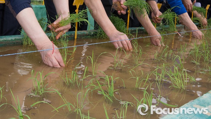 (청주=포커스뉴스) 14일 오후 충북 청주시 청원구 오창읍 충북농업기술원에서 열린 기능성 유색미 신품종 육성을 위한 첫 모내기 행사에서 박제국 충북행정부지사와 직원들이 모내기를 하고 있다.