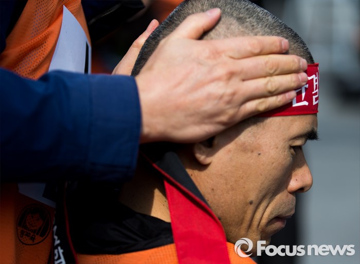 (서울=포커스뉴스) 14일 오후 서울 종로구 정부서울청사 앞에서 전국교직원노동조합 전임자들이 정부의 법외노조 후속조치와 부당탄압에 항의하며 삭발식을 하고 있다.