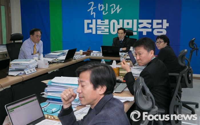 (서울=포커스뉴스) 20대 총선을 30일 앞둔 14일 오후 서울 여의도 더불어민주당사에서 열린 청년 비례대표 후보 면접에 참석한 홍창선 공천관리위원장 등 위원들이 후보들의 발언을 듣고 있다.