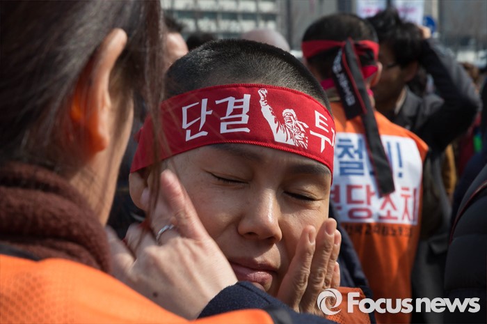 (서울=포커스뉴스) 14일 오후 서울 종로구 정부서울청사앞에서 열린 '부당해고 철회 촉구 삭발투쟁 기자회견'에서 조합원들이 서로 격려하고 있다.