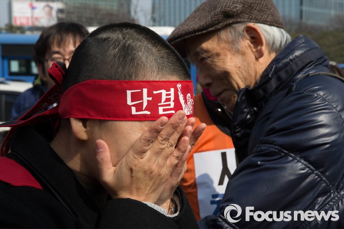 (서울=포커스뉴스) 14일 오후 서울 종로구 정부서울청사앞에서 열린 '부당해고 철회 촉구 삭발투쟁 기자회견'에서 한 조합원이 삭발 후 얼굴을 감싸고 있다.