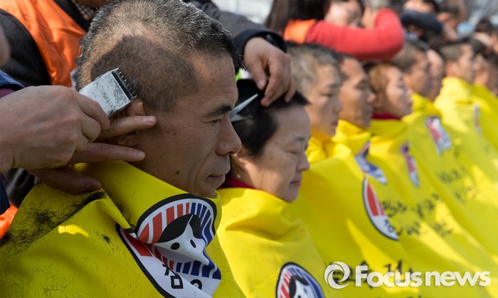 (서울=포커스뉴스) 14일 오후 서울 종로구 정부서울청사 앞에서 전국교직원노동조합 전임자들이 정부의 법외노조 후속조치와 부당탄압에 항의하며 삭발식을 하고 있다.