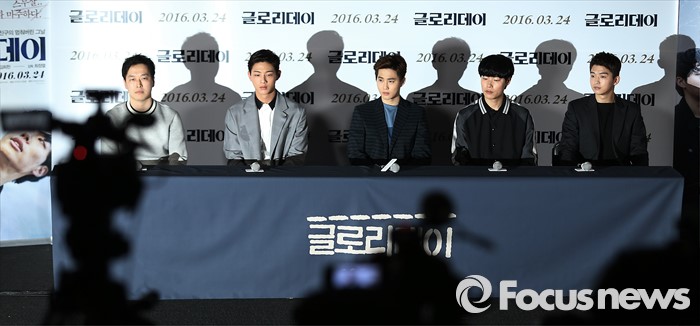 (서울=포커스뉴스) 14일 오후 서울 성동구 왕십리 CGV에서 열린 영화 '글로리데이' 언론시사회에 영화감독 최정열(왼쪽부터)과 배우 지수, 김준면, 류준열, 김희찬이 참석하고 있다.