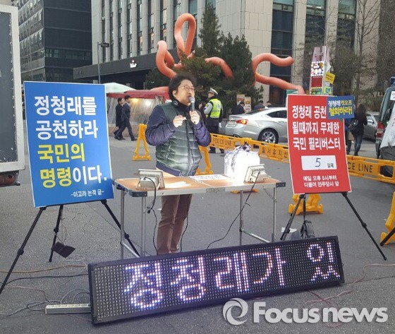 14일 오후 서울 여의도에 위치한 더민주 당사 밖에서는 지난 10일 낙천된 정청래 의원(서울 마포갑) 구제를 요구하는 정 의원 지지자들의 릴레이 필리버스터 시위가 5일 째 이어졌다.