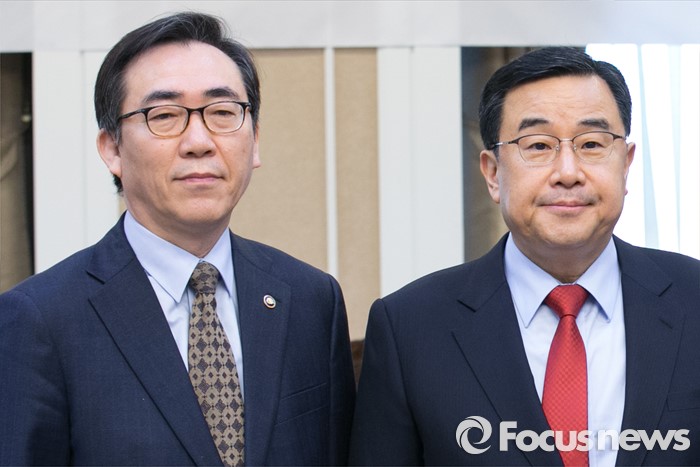 (서울=포커스뉴스) 김정훈(오른쪽) 새누리당 정책위의장과 조태열 외교부 2차관이 15일 오전 서울 여의도 국회 귀빈식당에서 열린 안보상황 점검 긴급 당정협의에 참석해 기념사진을 찍고 있다.