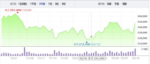 김동양 NH투자증권 연구원은 “2017년 FDA(미국 식품의약국) 신약판매 승인 신청, 2018년 본격 시판을 목표로 하고 있다”며 “2018년은 제약사업이 주도하는 이익성장성이 강화될 것”이라고 예상했다.주가흐름<사진출처=네이버 캡쳐>