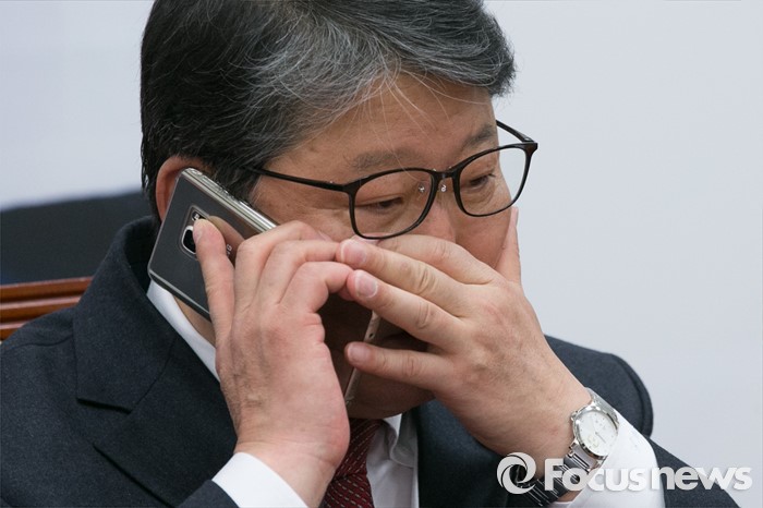 (서울=포커스뉴스) 조원진 새누리당 원내수석부대표가 15일 오전 서울 여의도 국회에서 열린 원내대책회의에 참석해, 전화 통화를 하고 있다.