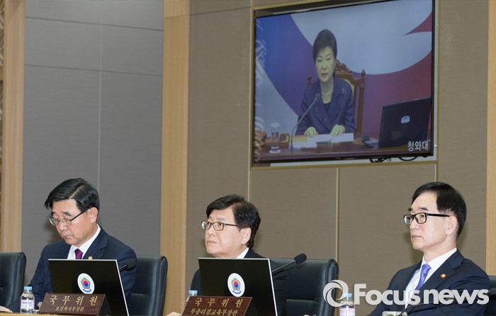 (세종=포커스뉴스) 15일 오전 세종시 정부세종청사 국무회의장에서 열린 청와대-세종청사 국무회의에서 국무위원들이 영상을 통해 박근혜 대통령의 모두발언을 경청하고 있다.