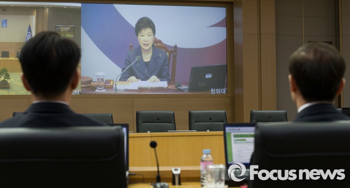 (세종=포커스뉴스) 15일 오전 세종시 정부세종청사 국무회의장에서 열린 청와대-세종청사 국무회의에서 국무위원들이 영상을 통해 박근혜 대통령의 모두발언을 경청하고 있다.
