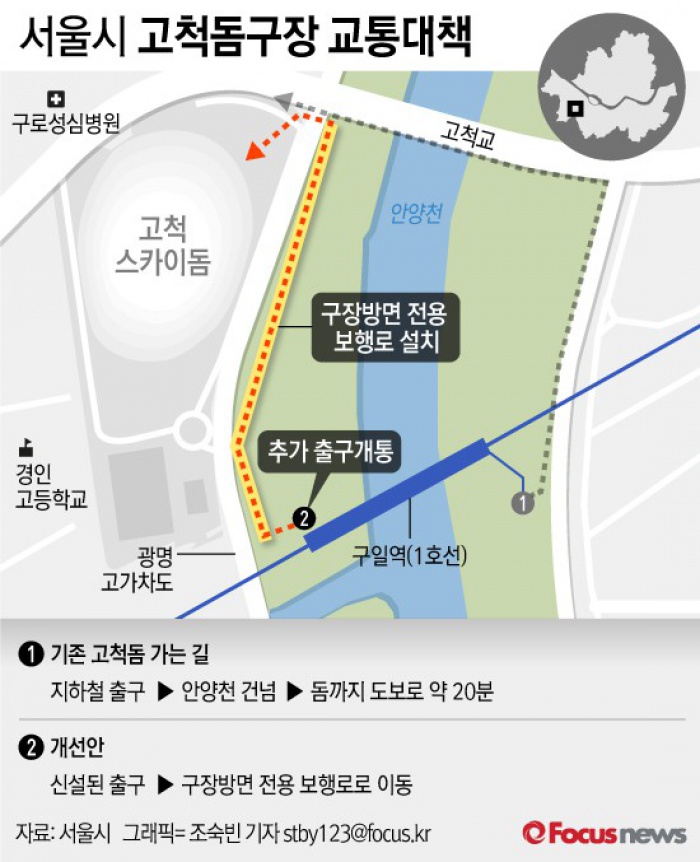 (서울=포커스뉴스) 서울시는 야구시즌 개막에 맞춰 고척스카이돔으로 연결되는 서울 지하철 1호선 구일역 서쪽 출입구를 이번달 말까지 완공하고, 구장방면 전용 보행로를 설치해 '접근성'을 높일 예정이다.