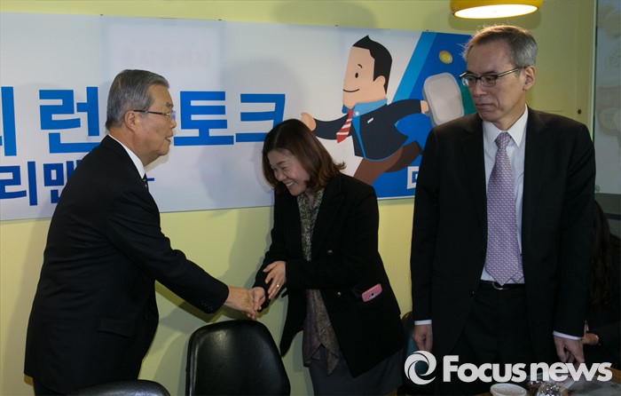 (서울=포커스뉴스) 김종인(왼쪽) 더불어민주당 비대위 대표가 15일 오후 서울 여의도 한 카페에서 열린 경제할배와 허심탄회 런치토크 - 샐러리맨편 행사에 참석해 직장인들과 인사하고 있다. 오른쪽은 주진형 총선정책공약단 부단장.