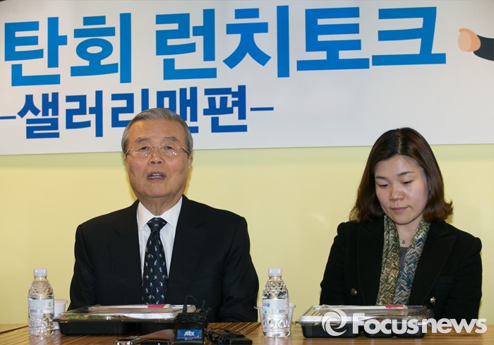 (서울=포커스뉴스) 김종인(왼쪽) 더불어민주당 비대위 대표가 15일 오후 서울 여의도 한 카페에서 열린 경제할배와 허심탄회 런치토크 - 샐러리맨편 행사에 참석해 인사말을 하고 있다.