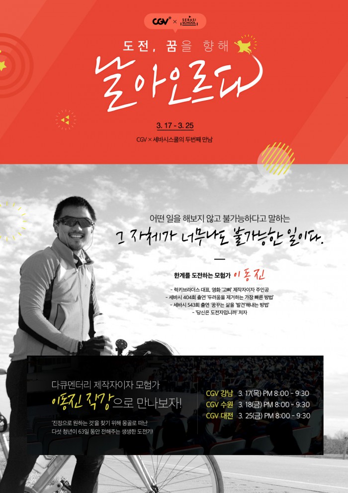 CGV는 청년 모험가 이동진을 초청해 '도전, 꿈을 향해 날아오르다'라는 제목의 강연 프로그램을 마련했다고 15일 밝혔다.